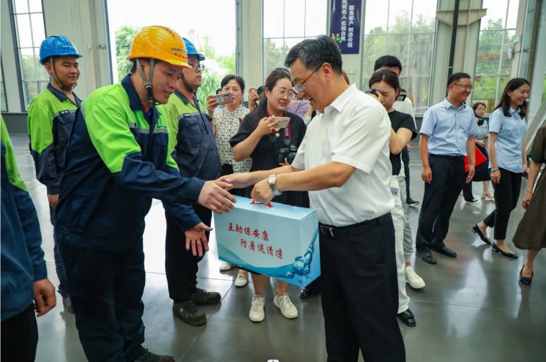 “關愛職工生活,促進安全生產”慰問組一行人走進生產車間,走訪慰問堅守工作崗位的一線職工,為他們送去茶葉、水杯、洗化用品、毛巾、鹽汽水等降溫防暑等物品,并叮囑他們增強自我保護意識,注意防暑降溫。